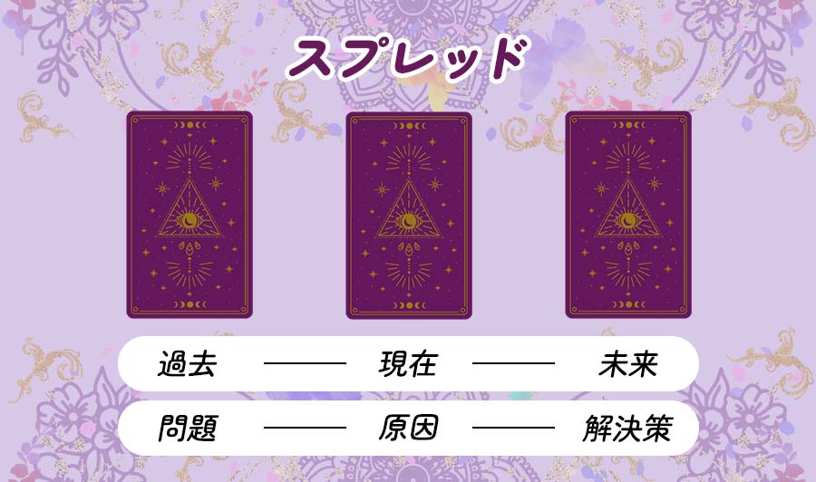 カードの展開(スプレッド)方法は沢山あるので、慣れてきたら色々挑戦してみてくださいね。[/chat]